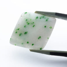 乳白色の中に緑色の斑点が浮かんでいますが、この緑色がウバロバイトガーネットです。乳白色部分はプレナイト(葡萄石)です。以前は翡翠だと勘違いをされていた歴史があり近年この緑色がウバロバイトだということがわかっという記事がGIAのレポートにありました。流通量は極めて少なく海外のマーケットでもあまり見ることができません。珍しいガーネットやレア共生をお探しの方におすすめ。